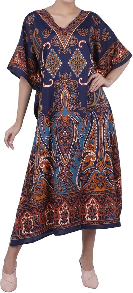 - Indian Paisley Floral Print with Elegant V Neck Design, Ethnic Print African & Dubai Inspired Beach Kaftan Dresses for Women: Crafted with a detailed Indian inspired paisley floral print, this stylish Kaftan Dress for Women features intricate ethnic patterns and rich resort tones that create a timeless look. The flattering V neck design enhances the neckline, while relaxed batwing short sleeves provide breathable comfort and effortless flow. Perfect as a Summer Swimsuit Cover Up Maxi Beach Dress