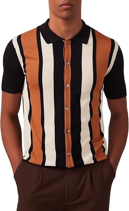 • 80s Vintage Features knitted polo shirts. Constrasting mod pattern, brightly colored, short sleeve, polo collar in a button through style.